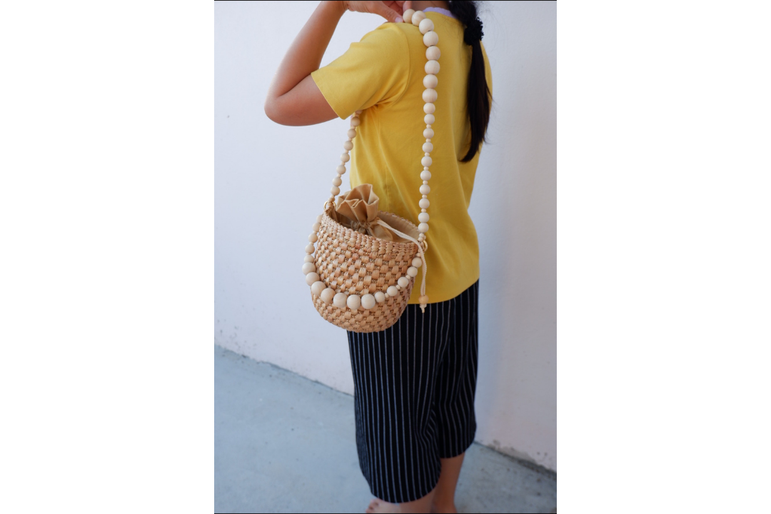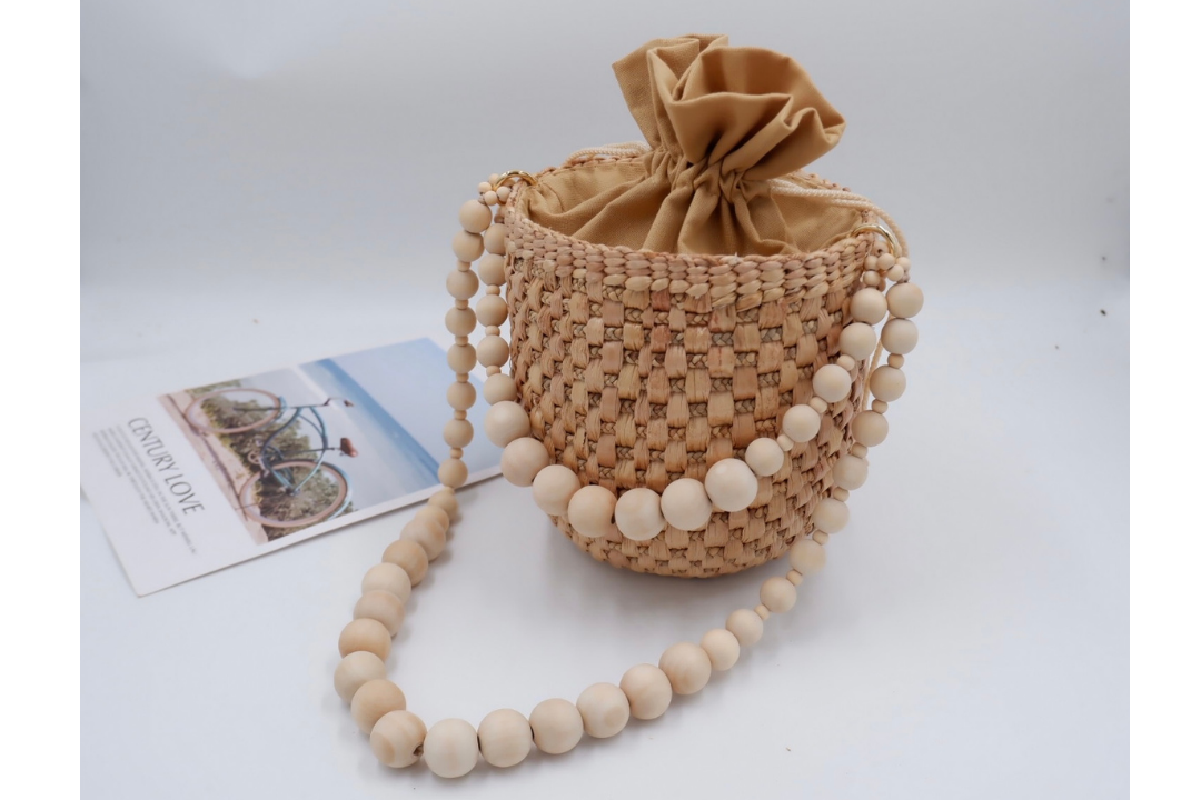 straw bucket bag with wooden bead handle
